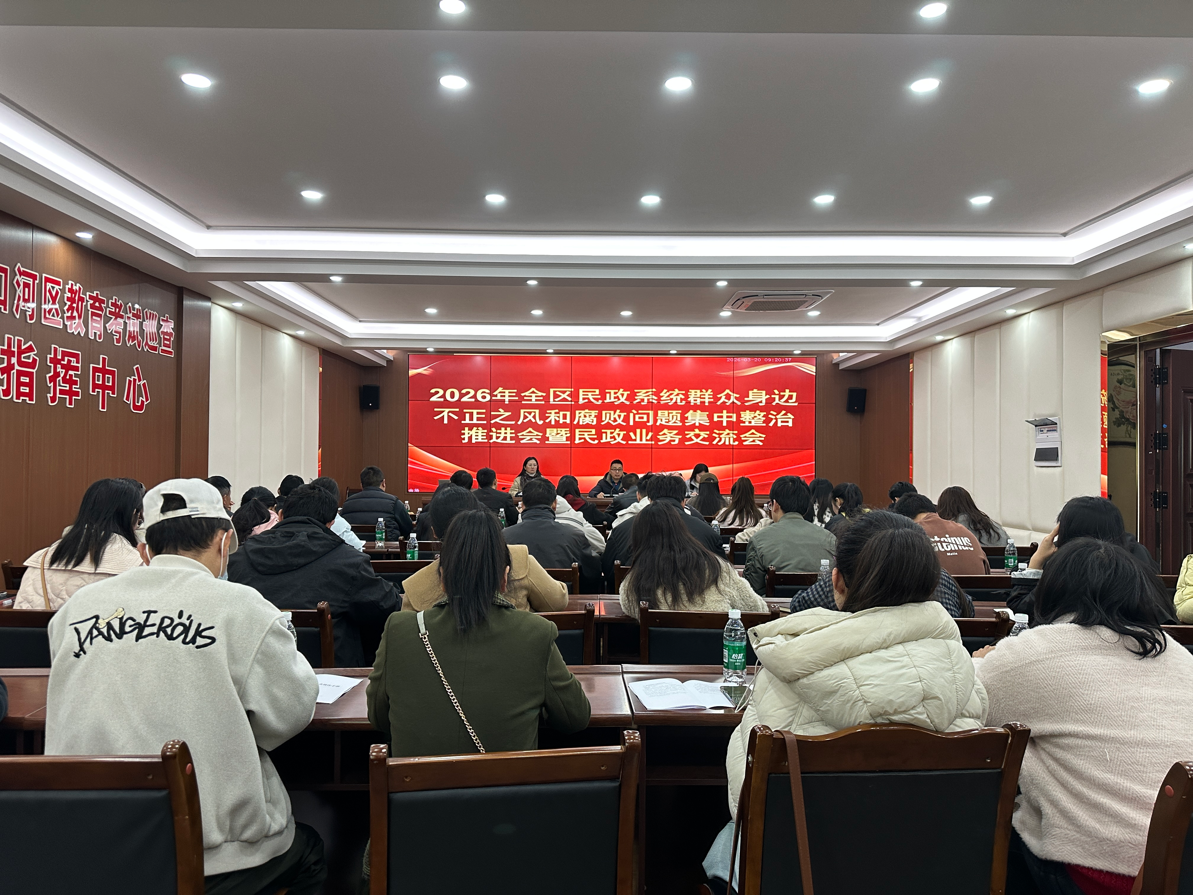 3月20日,区民政局组织召开2026年全区民政系统群众身边不正之风和腐败问题集中整治推进会暨民政业务交流会。区民政局党组书记、局长梁德强主持会议,各乡镇分管领导、民政助理员,村(社区)民政协理员,以及区民政局班子成员、业务工作人员参加会议。
