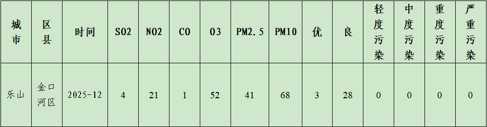 2025年12月份,金口河区空气质量综合指数3.3,全市排名第2位,65区排名第3位,193区(县)排名第68位;优良天数率100%,优良天数31天。