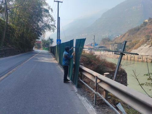 1月12日,蒲梯村村“两委”干部组织群众对G245国道沿线围挡进行维修。