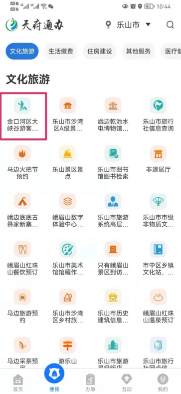 步骤二:进入便民服务,点击下方【文化旅游】按钮,就可以看到【金口河区大峡谷游客在线登记(文旅局)】栏目