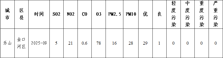 2025年9月份,金口河区空气质量综合指数2.1,全市排名第6位,65区排名第22位,193区县排名第124位;优良天数率100%,优良天数30天。