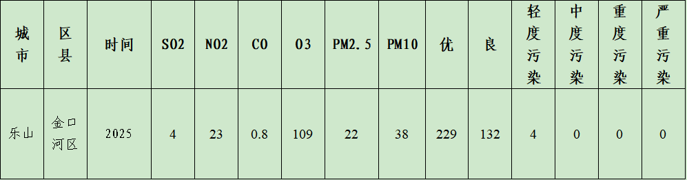 2025年1-12月份,金口河区空气质量综合指数2.7,全市排名第5位,65区排名第2位,193区(县)排名第75位;优良天数率98.9%,优良天数361天。
